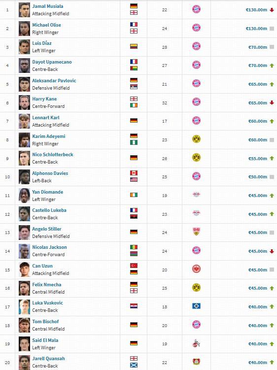 德甲身价更新:穆西亚拉1.3亿欧与奥利塞并列第一,凯恩6500万欧